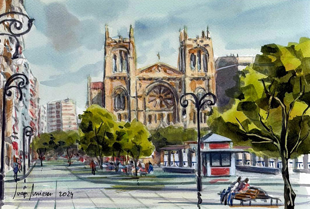 1 Acuarela Juan Mieres Iglesia de San Lorenzo Xixón